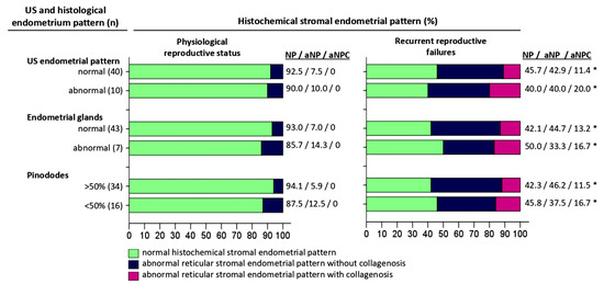 Comparative characteristics of histochemical pattern, ultrasound, and histological pattern of the endometrium from the middle stage secretion phase of menstrual cycle. Abbreviations: US—ultrasonographic investigation; NP—normal histochemical reticulin–collagen stromal endometrial pattern; aNP—abnormal reticular stromal endometrial pattern without collagenization; aNPC—abnormal reticular stromal endometrial pattern with collagenization. Notes: * Statistically significant difference versus physiological reproductive status (p < 0.05).