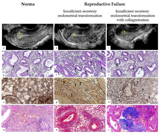 Representative ultrasonographic, histological, and histochemical endometrium patterns for physiological and pathological reproductive status. (a–d) Ultrasound and histopathological pattern of the endometrium with normal secretory transformation in the middle stage of the secretory phase ovarian cycle. (a) Ultrasonography. Homogeneous echogenic endometrium, endometrial thickness—12 mm (arrows). The echogenic pattern is typical for the secretory phase of the menstrual cycle. (b) Histopathological pattern. Convoluted endometrial glands with pseudostratified nuclei and a vacuolated cytoplasm, distinct subnuclear vacuoles located predominantly apically (arrows). The pattern of the glandular epithelium corresponds to the middle stage of the secretion phase. H&E staining: ×100. (c) Histochemical pattern of stromal reticular fibers (collagen type III). Reticulin fibers are arranged in an orderly manner, forming clear cellular structures; compartmented reticular stromal structure with formation of endometrial stromal channels (arrows). Gomori’s staining: ×400. (d) Histochemical pattern of stromal collagen (collagen type I). Thin filamentous collagen fibers located in the stroma of the endometrium (arrows). Masson’s trichrome staining: ×100. (e–h) Ultrasound and histopathological pattern of the endometrium with insufficient secretory endometrial transformation: abnormal noodle-like pattern collagen fibers (aNP). (e) Ultrasonography. Thin endometrium, thickness 5.5 mm (arrows). (f) The pattern of the glandular epithelium with delayed secretory transformation corresponds to the early stage of the secretion phase. Endometrial glands with pseudostratified nuclei and vacuolated cytoplasm and distinct parabasal vacuoles (arrows) H&E staining: ×100. (g) Histochemical pattern of stromal reticular fibers (collagen type III). Reticulin fibers are disordered, with a wave-like, tortuous, “noodle-like” pattern (arrows). (h) Normal, fine-thread-like, ordered collagen fibers, located mainly around the vessels and glands. (i–l) Ultrasound and histopathological pattern of the endometrium with insufficient secretory endometrial transformation with collagenization (aNPC). (i) Ultrasonography. Thin endometrium, thickness 6.5 mm (arrows). (j) Histopathological pattern. Endometrial glands with pseudostratified nuclei and vacuolated cytoplasm and distinct parabasal vacuoles (arrows). H&E staining: ×100. (k) Reticulin fibers with diffuse edema with microfragmentation and areas of disorganization (arrows). Gomori’s staining: ×400. (l) Histochemical pattern of stromal collagen (collagen type I). Abnormal foci of periglandular and perivascular deposition of homogeneous collagenous masses (arrows). Masson’s trichrome staining: ×100.