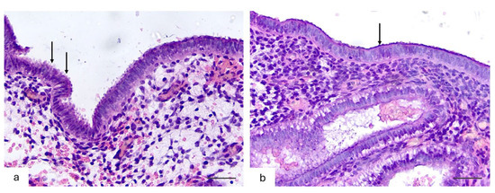Histological pattern of the endometrial surface epithelium in the middle phase of secretory transformation (21 days) in women with physiological reproductive status and recurrent reproductive failure/loss (H&E staining, ×400). (a) Endometrium of a woman with physiological reproductive status. Numerous pinopodes—apical protrusions of the cytoplasm, occupying more than 70% of the epithelial cell surface (indicated by arrows)— are clearly visible on the epithelial surface. (b) Endometrium of a patient with recurrent reproductive loss/failure. Apical protrusions are present singly and occupy less than 20% of the epithelial surface (indicated by arrow).