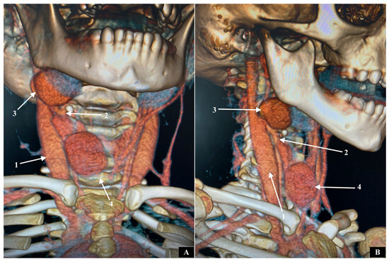 The patient, a four-year-old female, was admitted to the clinic for a scheduled examination due to the presence of an asymptomatic tumor on the right side of the neck during tension (Valsalva maneuver). Family members first noticed this tumor one year after birth. It was also observed that it was increasing in size over time. The investigation of the parents did not reveal any genetic diseases. The patient underwent ultrasonography and computed tomography angiography (CTA) of the neck. Two saccular aneurysms of a right communicating vein were identified. CTA shows that one was located above the jugular notch (with maximum diameter 3.8 cm), while the other was on the retroparotid area (with maximum diameter 3.2 cm) (Figure 1A,B). This communicating vein was located along the anterior border of the sternocleidomastoid muscle and connected the anterior jugular vein to the internal jugular vein.
