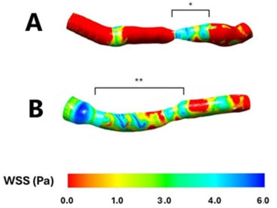 Wall shear stress in two sample patients having a focal, hemodynamically significant left anterior descending stenosis (Panel (A); *) and a diffuse, long, non-hemodynamically significant left anterior descending stenosis (Panel (B); **), respectively. WSS: Wall shear stress. Pa: Pascal.