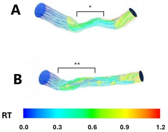 Resident time in two sample patients having a focal, hemodynamically significant left anterior descending stenosis (Panel (A); *) and a diffuse, long, non-hemodynamically significant left anterior descending stenosis (Panel (B); **), respectively. RT: Resident time.