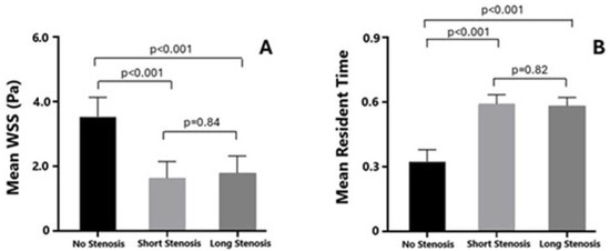 Comparison of mean wall shear stress (Panel (A)) and resident time (Panel (B)) between left anterior descending segments having a focal, hemodynamically significant, diffuse–long, non-hemodynamically significant stenosis and healthy left anterior descending segment.