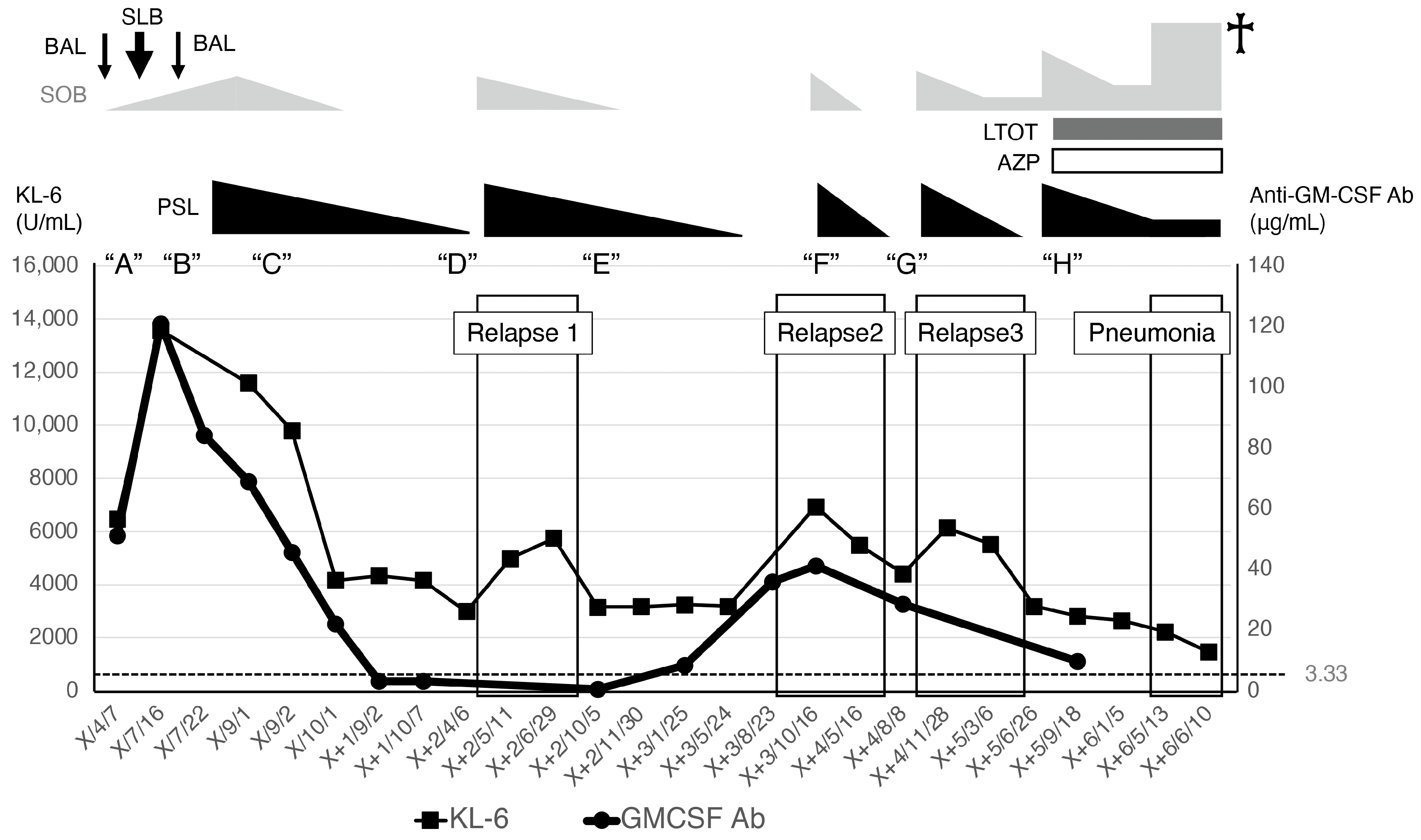 - Arai, T.; Kasai, T.; Shimizu, K.; Kawahara, K.; Katayama, K.; Sugimoto, C.; Hirose, M.; Okamoto, H.; Tachibana, K.; Akira, M.; et al. Autoimmune Pulmonary Alveolar Proteinosis Complicated with Sarcoidosis: The Clinical Course and Serum Levels of Anti-granulocyte-macrophage colony-stimulating Factor Autoantibody. Intern. Med. 2020, 59, 2539–2546. [Google Scholar] [CrossRef]