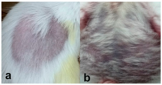 The mice in the experimental group rapidly developed SLE-like symptoms. Five weeks after the immunization, two of the mice in the experimental group developed alopecia areata. Twenty-eight weeks after the immunization, the mice in the experimental group began to lose their hair coat. These changes in mice from the experimental group are shown in Figure 2a,b.