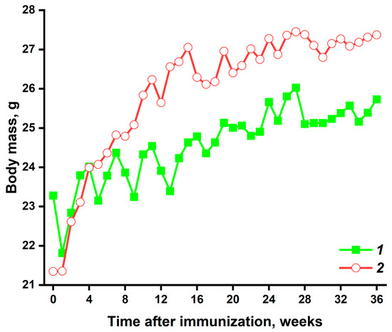 Weight change in experimental and control mice during the study. Points on the graph indicate median values. 1—PBS-immunized mice (n = 8), 2—pristane-immunized mice (n = 12). From week 8 (except at weeks 24 and 26), differences in weight were significant (not shown in the figure). The statistical significance of differences between the two groups at each time point was assessed using the Mann–Whitney test.
