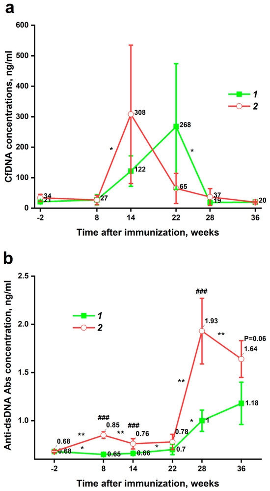 Plasma total cfDNA (a) and anti-dsDNA antibodies (b) concentration at six time points. Results are presented as median values. The whiskers on the graphs represent the absolute median deviation. 1—PBS-immunized mice (n = 8), 2—pristane-immunized mice (n = 12). The * symbol indicates a statistically significant difference between adjacent time points within the same group. Statistical significance was determined using the Wilcoxon test for paired samples. The # symbol indicates a statistically significant difference between the two groups at the same time point. Statistical significance of differences was assessed using the Mann–Whitney test. *—0.05 > p > 0.01; **—0.01 > p > 0.001; ###—p > 0.001.