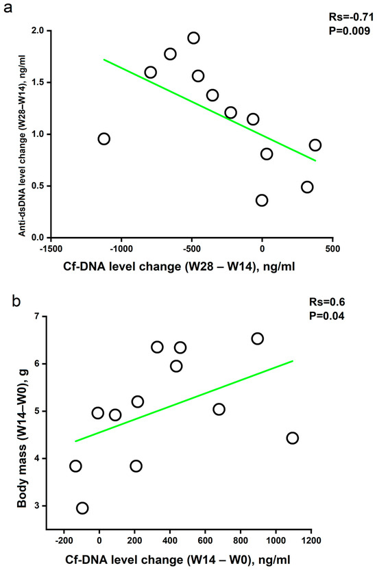 Correlation between the absolute change in the concentration (delta) of anti-dsDNA Abs and total cfDNA in plasma of mice from the experimental group (n = 12) from week 14 to week 28 after immunization (a). Correlation between the absolute change (delta) in body weight and cfDNA concentration in mice from the experimental group from week 0 to week 14 after immunization (b). Rs is Spearman’s correlation coefficient. Each dot represents changes in a specific mouse.