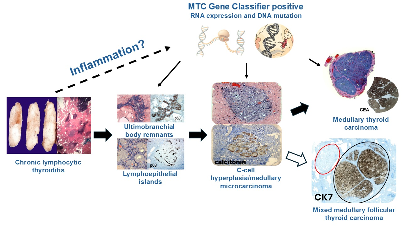 A primary reason for reporting this case was to show both morphologically and genetically that a relationship may exist pathogenetically between the UBB, CCH/MMC, and MTC and that this case may indeed demonstrate a neoplastic sequence of progression from the UBB to cancer of C-cells. It was noted earlier that some of the epithelial elements, particularly within LEIs, that were marked as UBB had glandular profiles and nuclear features almost indistinguishable from those seen in papillary thyroid carcinomas. One could legitimately question whether these epithelial elements within the LEI described in this case were indeed UBB and that is legitimate, with the caveat that as far as we know, UBB/UBB remnants are the only epithelial elements that express p63 in the thyroid. In addition, characteristic squamous morules heralded as constituents of the SCN (UBB remnants) accompanied these glandular and glomeruloid profiles. Speculation that MTC may represent a neoplastic sequence originating with the UBB is not novel. This has been postulated as the ontogeny of so-called mixed medullary and follicular thyroid carcinomas (MMFTCs) where the follicular epithelium is intermixed with neoplastic C-cells (not collision tumors) [