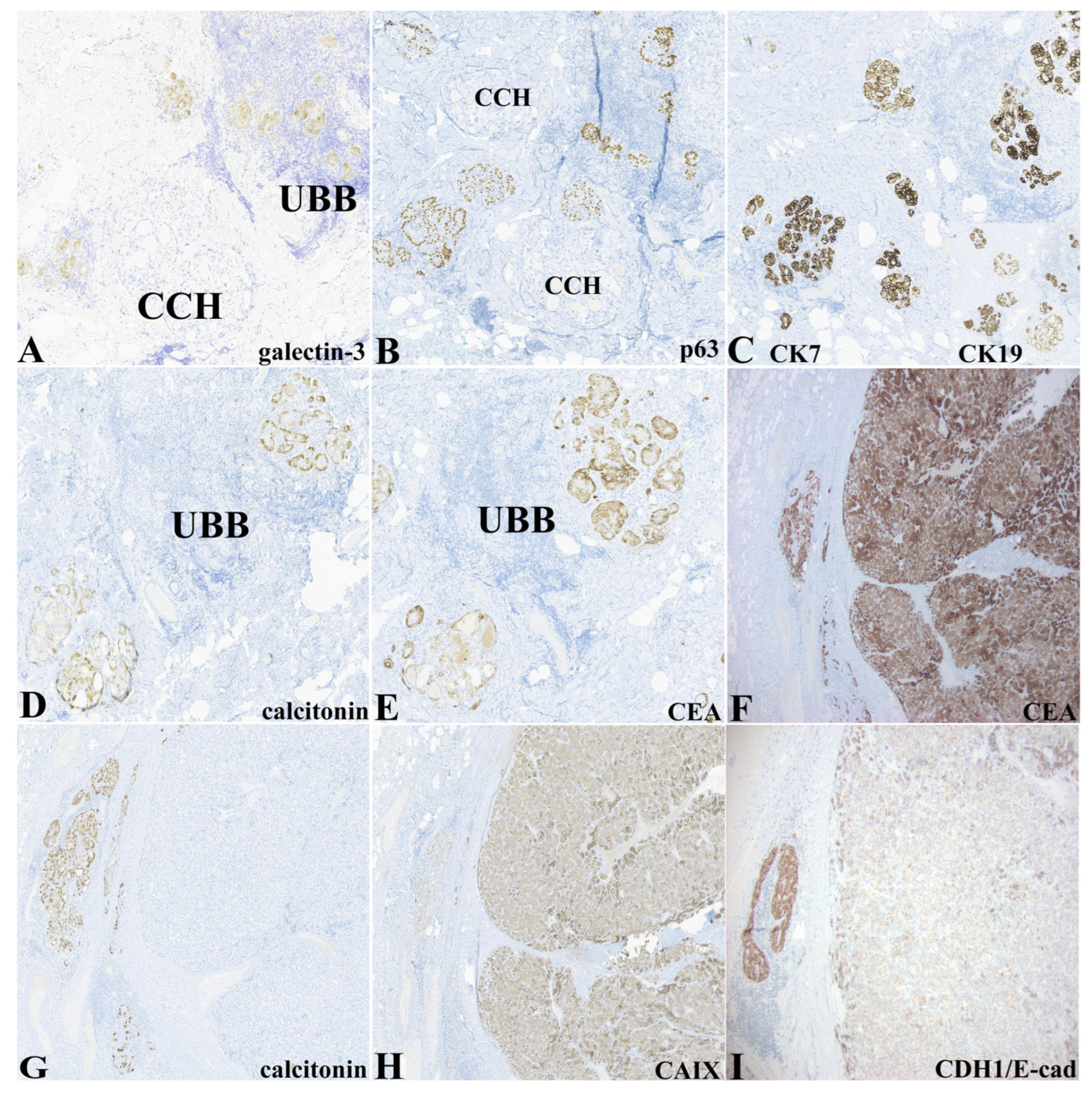 Figure 2D,G). Otherwise, the areas of CCH/MMC and MTC displayed similar intensity and distribution of expression for IHC biomarkers, including classic neuroendocrine markers (CD56, chromogranin, synaptophysin, PGP9.5). Expression of carcinoembryonic antigen (CEA-M) was restricted to CCH/MMC and MTC (