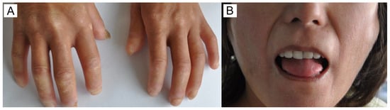(A): Skin impairment in SSc patient: dense edema, digital ulcers, and puffy fingers. (B): Perioral soft tissue fibrosis and skin thickness resulted in microstomia.