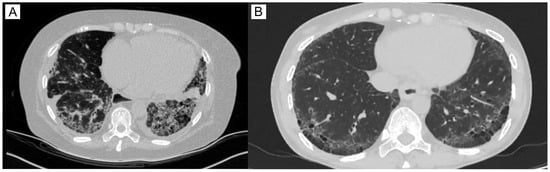 The main group consists of 26 Kazakh patients who have had SSc for the last 9.65 ± 9.8 (mean ± SD) years. mRSS was equal to 16 ± 7.2 and EScSG to 3.54 ± 2.18. In the majority of patients, 96% (25/26), various skin lesions were observed, including skin thickening, varying in extent, dense edema, “purse-string” mouth, sclerodactyly, digital ulcers, puffy fingers, and hyper- and hypopigmentation (Figure 1). Articular injury manifested in the form of polyarthralgia or arthritis was found in 23/26 patients (88%), as well as vascular disturbances (Raynaud’s phenomenon). Overall, 19 of 26 patients had frequent lesions of the gastrointestinal tract, in the form of esophagitis (73%). Seventeen patients suffered from lung impairment, which manifests as interstitial lung disease (SSc-ILD) with signs of non-specific interstitial pneumonia (NSIP, more common) or usual interstitial pneumonia (UIP) that has been found on high-resolution computed tomography (Figure 2). Ten patients (38%) were diagnosed with a secondary Sjögren’s syndrome, characterized by xerostomia and xerophthalmia. Three patients had thyroid impairment (12%) and two cardiovascular disorders (7.6%, Supplementary Table S1).