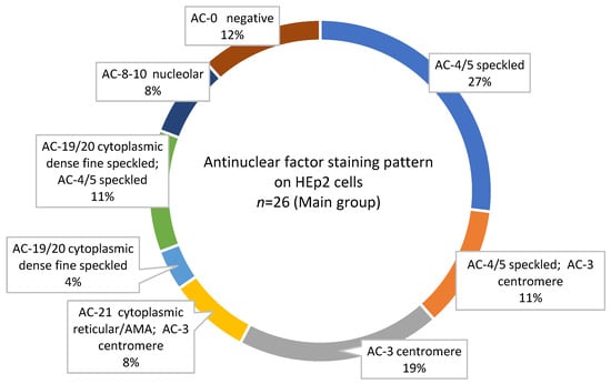 The presence of antinuclear factor was tested using an ANA plus kit (Medipan and Generic Assays GmbH, Berlin, Germany) using an indirect immunofluorescence assay (IFA). The cell substrate was immobilized on microscope slides. In the first stage, control samples and pre-diluted patient serum at a titre of 1:80 in a volume of 25 µL were placed in the wells on the slide, followed by incubation in a humid chamber for 30 min. Then unbound immune complexes were removed by washing for 5 min twice in a Coplin jar with washing buffer. Antibodies bound to antigens in HEp-2 cells interacted with 25 µL of conjugate (fluorescein-labelled secondary polyclonal antibodies—FITCs), incubated in a humid chamber for 30 min, after which the washing stage was repeated. Next, a covering buffer (PBS buffered solution with glycerol, containing DAPI and sodium azide) was applied to each well on the microscope slide. The prepared slides were scanned using the Aklides automatic system with a description of the type of fluorescence (glow) and titre in accordance with the International Consensus on Antinuclear Antibody Patterns (ICAP, anapatterns.org).