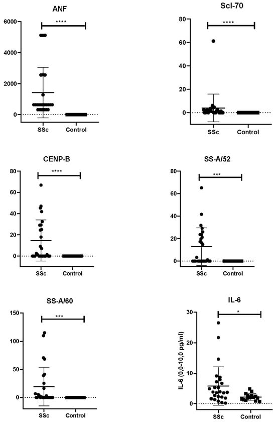 Serum autoantibody and cytokine profiles in Kazakh patients. Scatter plots show serum levels of antinuclear factor (ANF), anti-Scl-70, anti-CENP-B, anti-SS-A/Ro52, anti-SS-A/Ro60 antibodies, and interleukin-6 in SSc patients (n = 26) and healthy controls (n = 18). Bars represent the mean ± SD. Statistical significance was determined using the Mann–Whitney U test with **** for p < 0.0001, *** for p < 0.001 and * for p < 0.05. Elevated levels of ANF, anti-Scl-70, anti-CENP-B, and SS-A antibodies, as well as IL-6, were observed in the SSc group compared with controls.