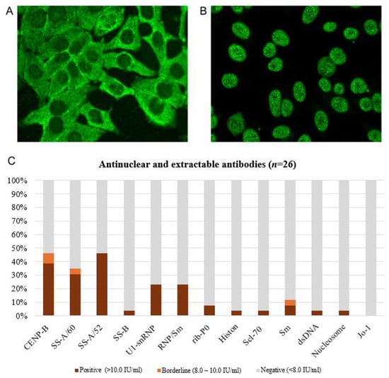 The samples that tested positive for any antibodies were subjected to additional testing using the ANA cytobead kit (Medipan and Generic Assays GmbH, Berlin, Germany) to determine the quantitative concentration in IU/mL of antibodies to Smith, SS-A/60, SS-A/52, SS-B, Scl-70, CENP-B, RNP/Sm, and dsDNA. The ANA cytobead kit is a combined reagent that includes the semi-quantitative determination of antinuclear factor on HEp-2 cells and the quantitative determination of specific antibodies by the indirect immunofluorescence assay in serum. A substrate with HEp-2 cells and microparticles (beads) labelled with antigens were immobilized on a slide. For the first stage, controls, calibrators, and pre-diluted patient sera in a volume of 80 µL were placed on the slide and incubated in a humid chamber for 30 min. Then unbound immune complexes were washed off (4 times for 2 min in a Coplin jar with washing buffer). The antibodies bound to antigens in HEp-2 cells and on microparticles interacted with 80 µL of conjugate (FITC). Incubation was performed in a humid chamber for 30 min, after which the washing stage was repeated. Next, a covering buffer (PBS buffered solution with glycerol, containing DAPI and sodium azide) was applied to each well on the microscope slide and scanned using the Aklides automatic system. The results were reported with a description of the type of fluorescence (glow), titre, and antibody concentration in IU/mL.