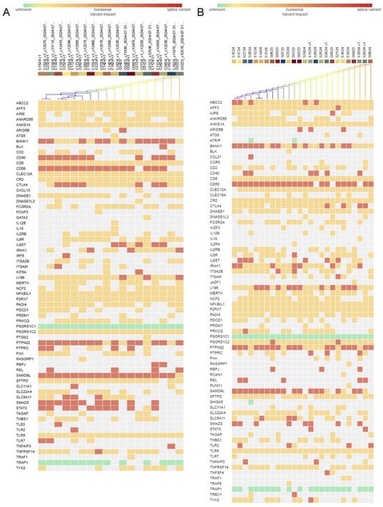 For SAMD9L, we detected two distinct variants that were classified as likely pathogenic according to ACMG criteria in eight individuals (representing 18.2% of the screened cohort). Previous research demonstrated that SAMD9L mutations correlated with cytopenia, and inflammatory presentations were previously published [18,19]. Our results revealed that four of these eight carriers also presented with autoimmune features. Notably, two patients exhibited the compound heterozygous state for the SAMD9L findings, mirroring earlier observations of functional loss-of-function or gain-of-function changes that can lead to complex autoinflammatory phenotypes [20].