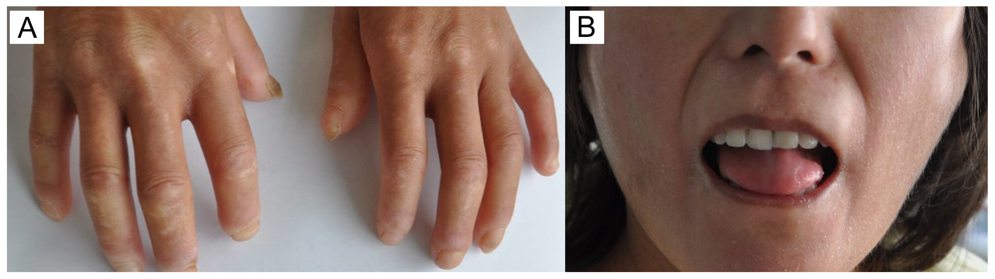 Figure 1. (A): Skin impairment in SSc patient: dense edema, digital ulcers, and puffy fingers. (B): Perioral soft tissue fibrosis and skin thickness resulted in microstomia.