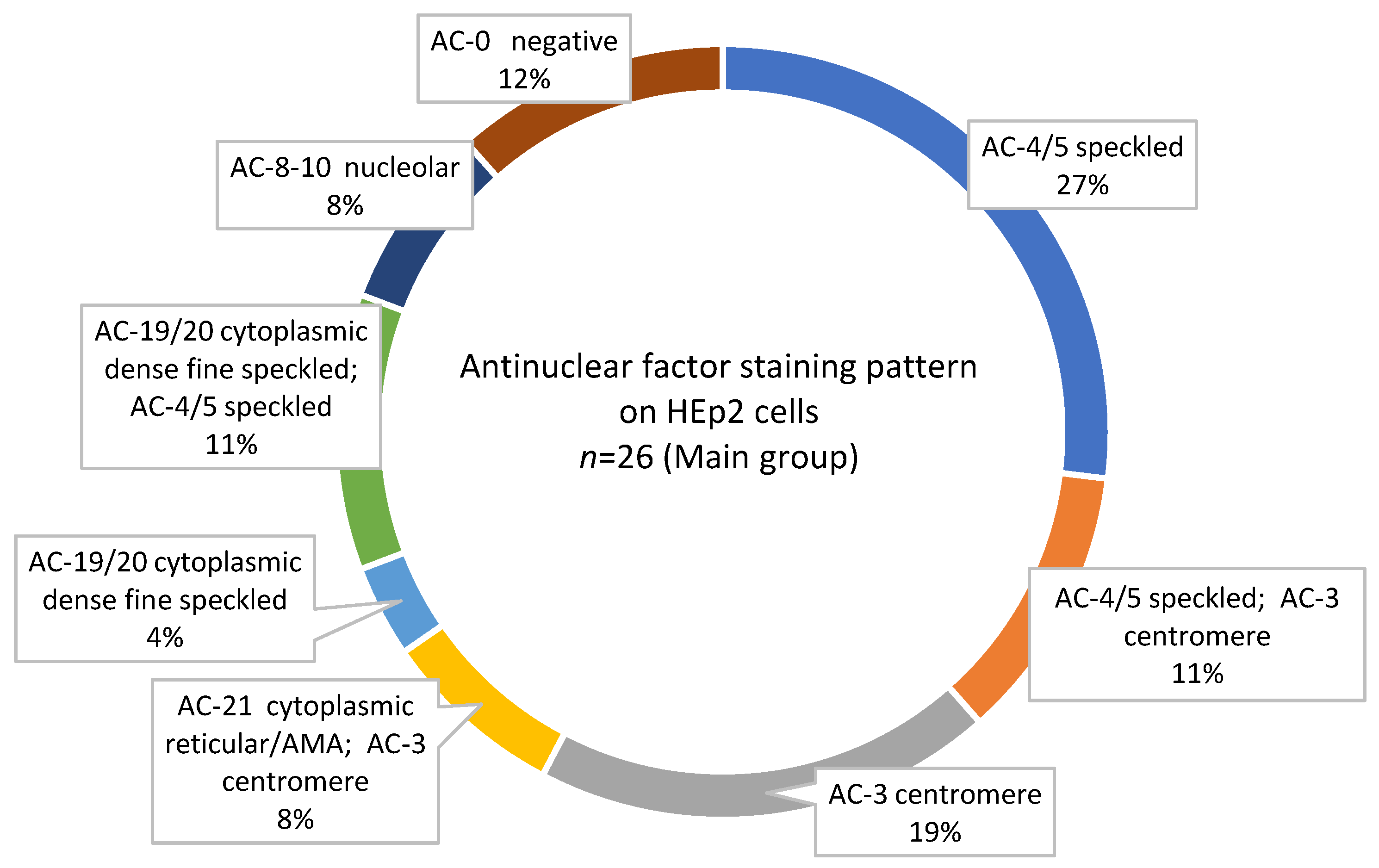 Table 1. Antinuclear factor of the main and control groups of patients. Reference interval < 1:80 negative, ≥1:80 positive. Antinuclear factor titre criteria: ≥1:80 (1:80–1:160)—diagnostic (cut-off point); ≥1:160—clinically significant titre.