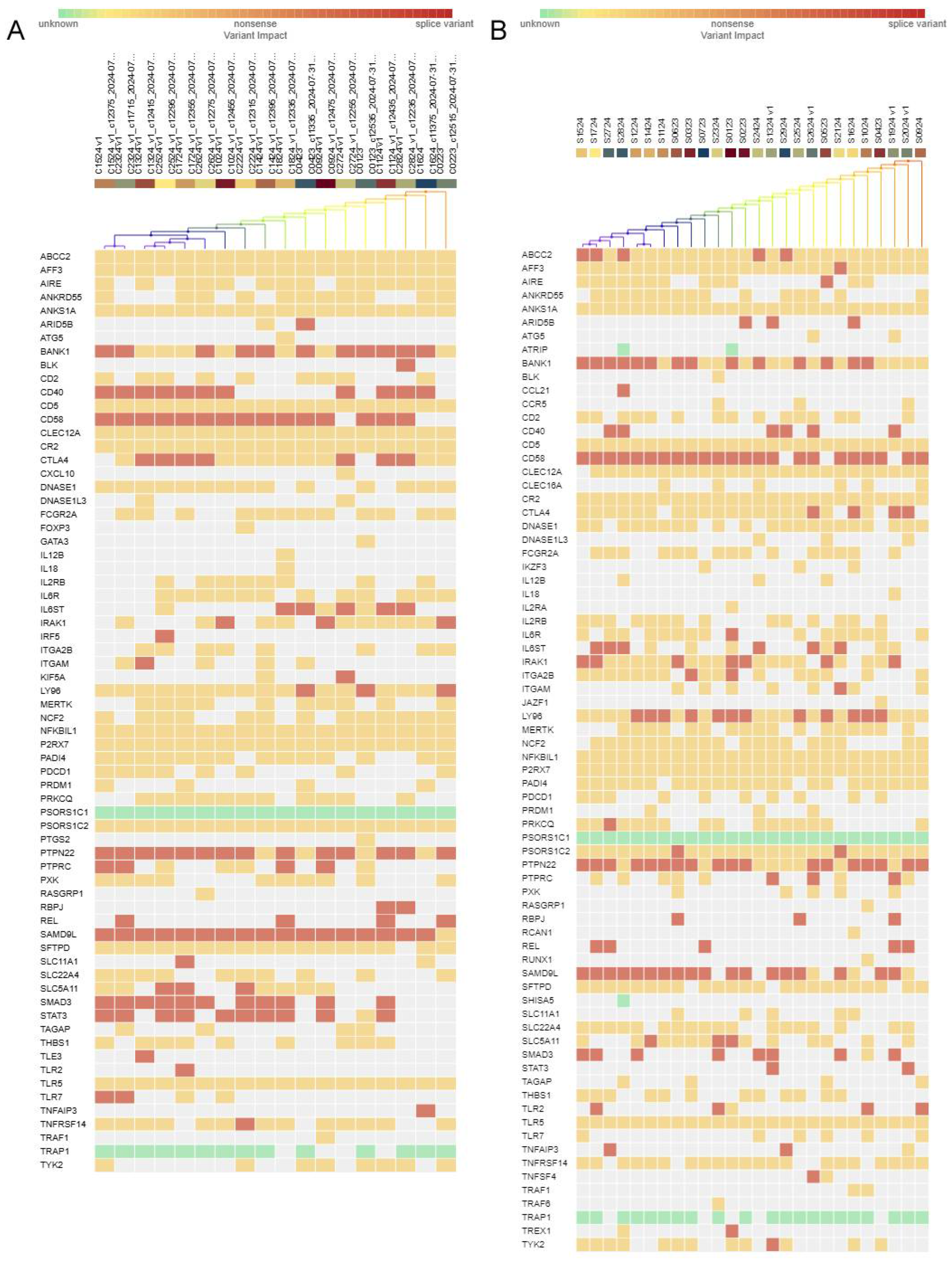 Figure 6. Comparative heatmaps of germline mutations in 120 target genes: (A) heatmap for 18 control samples; (B) heatmap for 26 systemic sclerosis samples. Rows represent targeted genes, and columns represent individual samples. Samples are hierarchically clustered based on mutation presence and predicted impact, as determined by IonReporter Software (Thermo Fisher Scientific, version 5.20). The colour scale indicates variant classification: green = variant of unknown impact, orange = missense variant, red = nonsense variant, maroon = splice variant, and white = no detected variant (at or above the applied threshold). Hierarchical clustering dendrograms are shown at the top of each heatmap, highlighting groups of samples with similar genetic alteration patterns. A minimum coverage of 30 reads was used as inclusion criteria. Genes on the y-axis are organized according to alphabetical order.