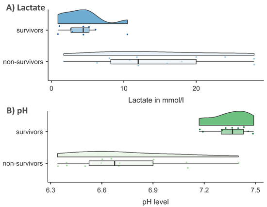 Violin plots of (A) lactate in mmol/L and (B) pH level in survivors and non-survivors.
