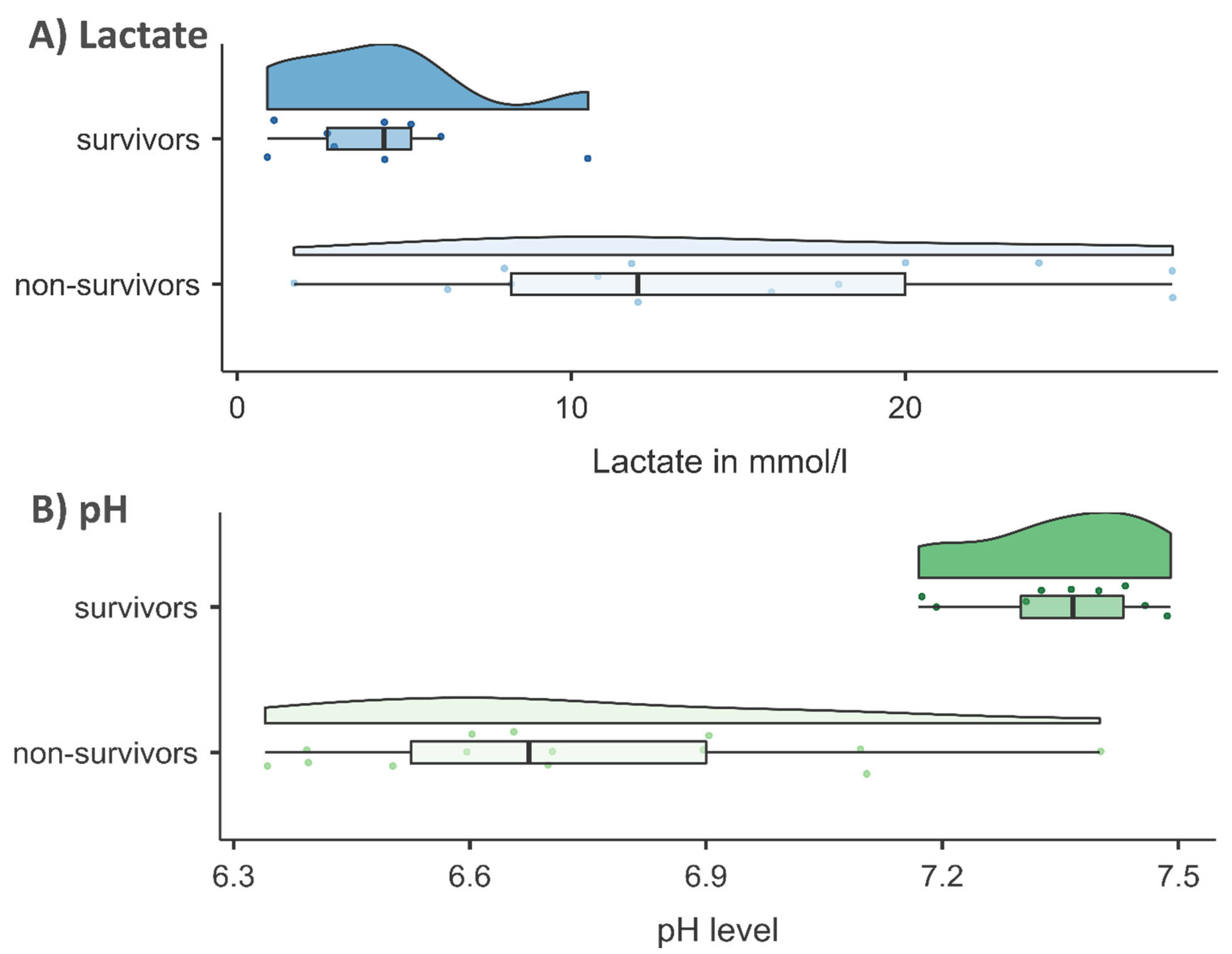 | Laboratory parameters on admission | Lactate [mmol/L] (0.5–2.2) | pH value (7.36–7.44) | Blood glucose [mmol/L] (4.0–7.8) | Heart enzymes [troponin in pg/mL (<14), CK-MB quotient in % (<6), myoglobin in µg/L (28–72)] |