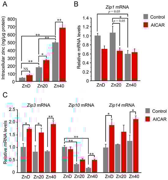 AICAR increased intracellular zinc only in zinc-sufficient and -supplemented myotubes, with distinct ZIP transporter responses. (A) Intracellular zinc concentration normalized to total protein content. (B,C) Relative mRNA expression of zinc transporters Zip1 (B) and Zip3, Zip10, Zip14 (C) determined by quantitative PCR. Two-way ANOVA revealed significant main effects of AICAR treatment and zinc condition, as well as their interaction, for Zip1 (p < 0.05 for all). Zip1 expression tended to decrease after AICAR stimulation under ZnD and Zn20 conditions, and was already lower at baseline in Zn40 compared with ZnD and Zn20. For Zip3, Zip14, and Zip10, AICAR main effects were significant (p < 0.05 for all). A significant zinc main effect and zinc × AICAR interaction were additionally observed only for Zip10 (p < 0.05). Post hoc comparisons are indicated by asterisks. Data are presented as mean ± SEM (n = 3 per group). * p < 0.05, ** p < 0.01, NS: not significant. Zn20 (20 μM ZnSO4) was used as a zinc-sufficient reference condition for comparative analyses in this in vitro system.