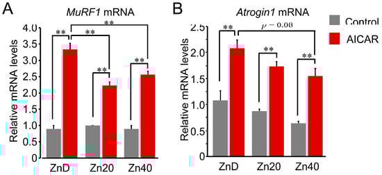 Zinc depletion is associated with AMPK-induced transcriptional upregulation of the ubiquitin-proteasome-related genes with distinct regulation of MuRF1 and Atrogin-1 at the mRNA level. (A,B) Relative mRNA expression levels of Trim63 (MuRF1) (A) and Fbxo32 (Atrogin-1) (B) in myotubes cultured under ZnD, Zn20, or Zn40 conditions, with or without AICAR treatment. Data are presented as mean ± SEM (n = 3 in each group). ** p < 0.01. Statistical comparisons include Control vs. AICAR within each zinc condition, as well as comparisons among zinc conditions where indicated. Zn20 (20 μM ZnSO4) was used as a zinc-sufficient reference condition for comparative analyses in this in vitro system.