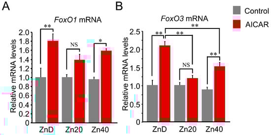 Zinc depletion is associated with greater AMPK-induced transcriptional upregulation of FoxO1 and FoxO3 at the mRNA level. (A,B) Relative mRNA expression of FoxO1 (A) and FoxO3 (B) in C2C12 myotubes cultured under ZnD, Zn20, or Zn40 conditions, with or without AICAR treatment. Data are presented as mean ± SEM (n = 3 in each group). * p < 0.05, ** p < 0.01, NS: not significant. Statistical comparisons include Control vs. AICAR within each zinc condition, as well as comparisons among zinc conditions where indicated. Zn20 (20 μM ZnSO4) was used as a zinc-sufficient reference condition for comparative analyses in this in vitro system.