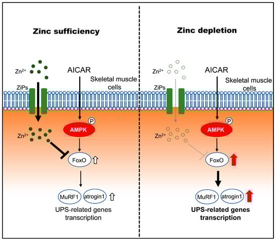Proposed model illustrating how zinc status modulates downstream atrophic responses to AMPK activation in C2C12 myotubes. Under zinc-sufficient conditions, AMPK activation by AICAR is associated with transcriptional regulation of FoxO and UPS-related genes and is accompanied by increased intracellular zinc availability, potentially involving stress-responsive ZIP transporters (ZIP3, ZIP10, and ZIP14), which may contribute to limiting excessive atrophic gene induction. Under zinc-depleted conditions, AMPK activation fails to increase intracellular zinc availability despite ZIP transcriptional responses and is associated with enhanced transcriptional upregulation of FoxO1/3 and the atrophy-related genes MuRF1 and Atrogin-1, consistent with increased susceptibility to AMPK-induced myotube atrophy.
