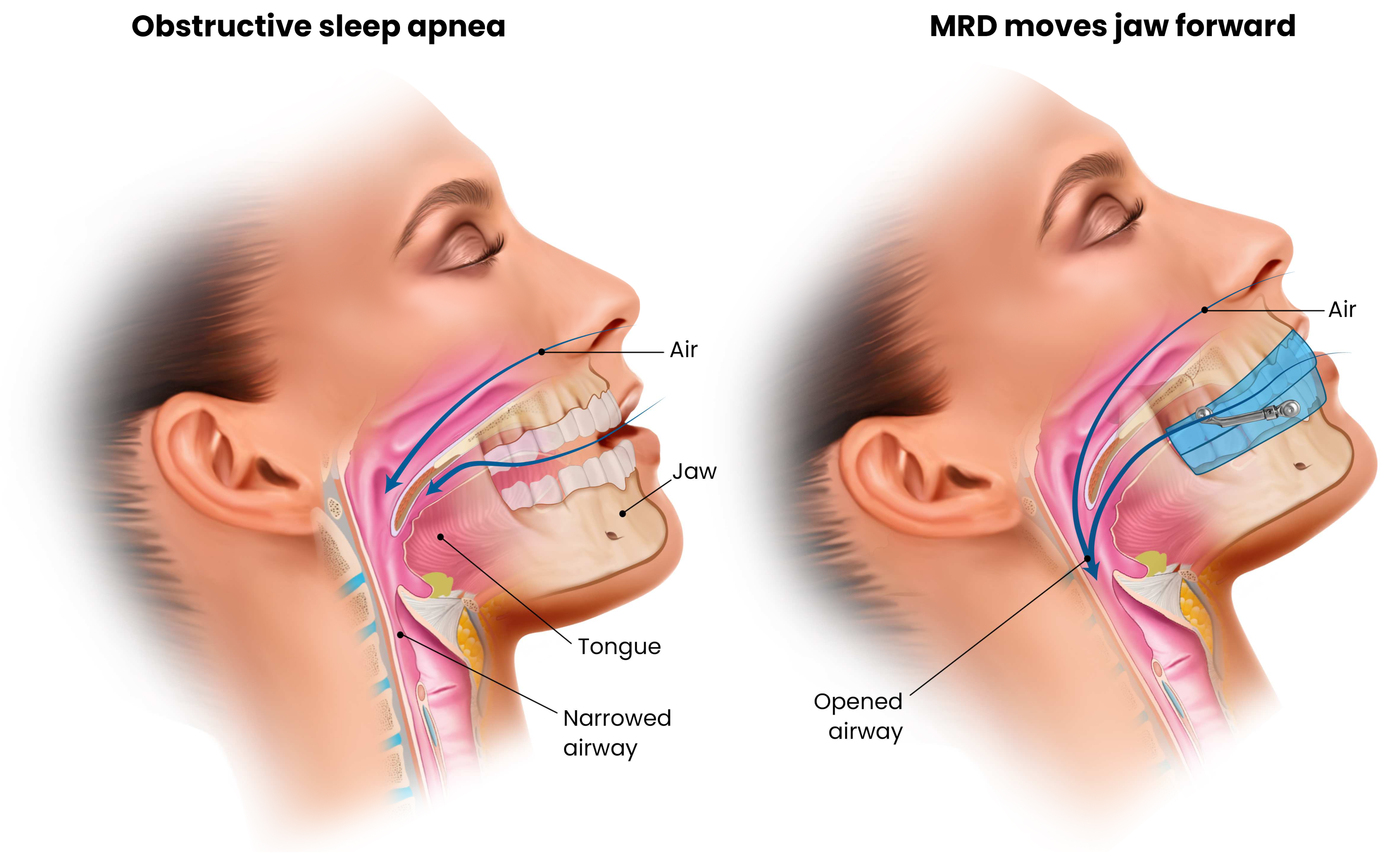 25]. This results in an enlarged retroglossal airway space, with reduced collapsibility during sleep. Imaging and endoscopic studies demonstrate increased velopharyngeal cross-sectional area and reduced pharyngeal compliance with a MAD in place [