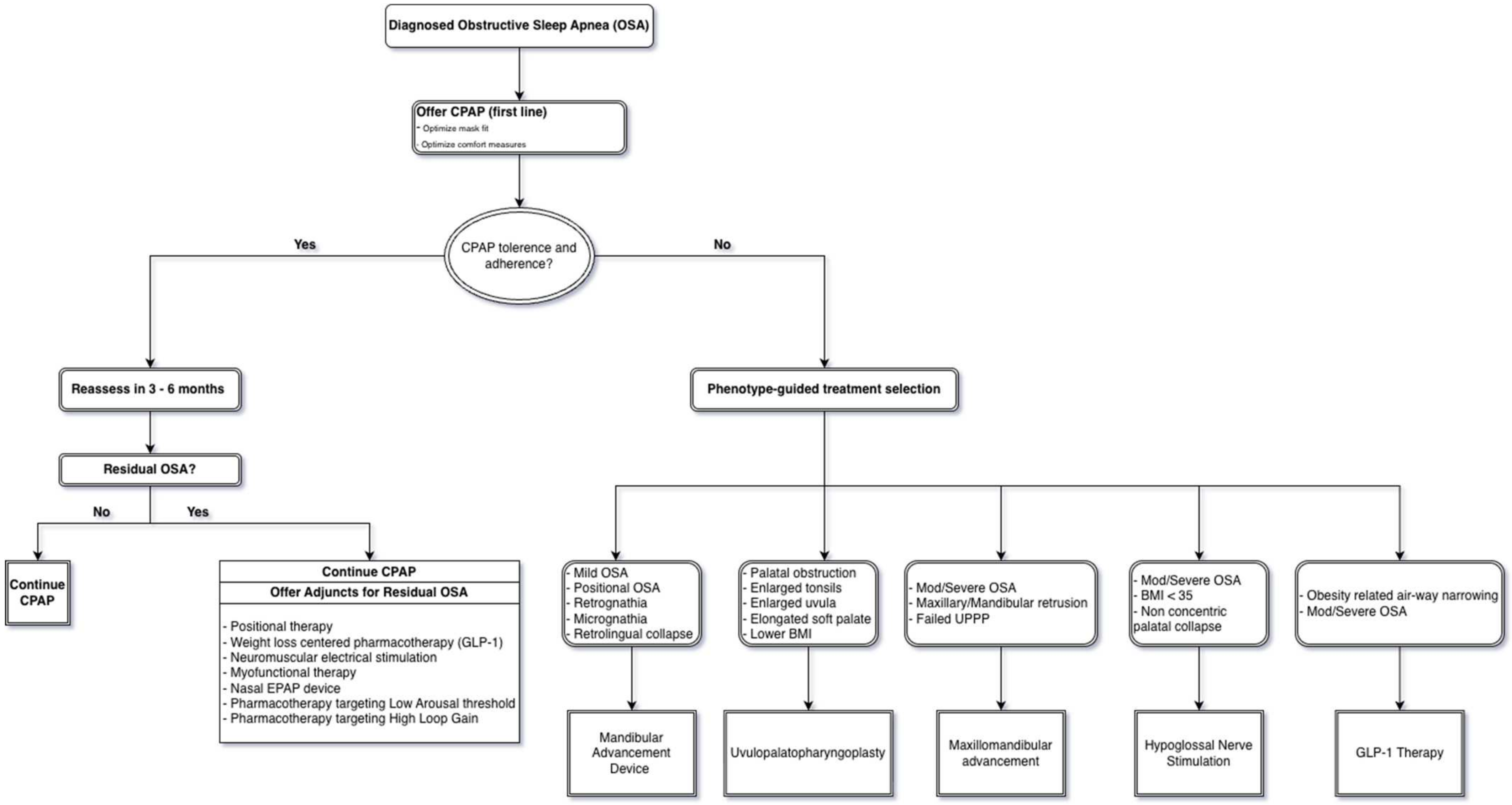 Taken together, these data support a model in which no single therapy universally dominates, but rather where optimal management arises from aligning therapy with phenotype—anatomic, neuromuscular, ventilatory control, arousal threshold, and metabolic load (