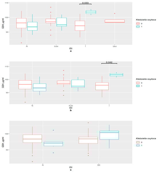 Firstly, the ISI groups were investigated. K. oxytoca influences GSH content in the insomnia group (p < 0.05), not in the subclinical insomnia and the control groups (Figure 2a,b). The binomial ISI division provided no statistically significant results (Figure 2c).