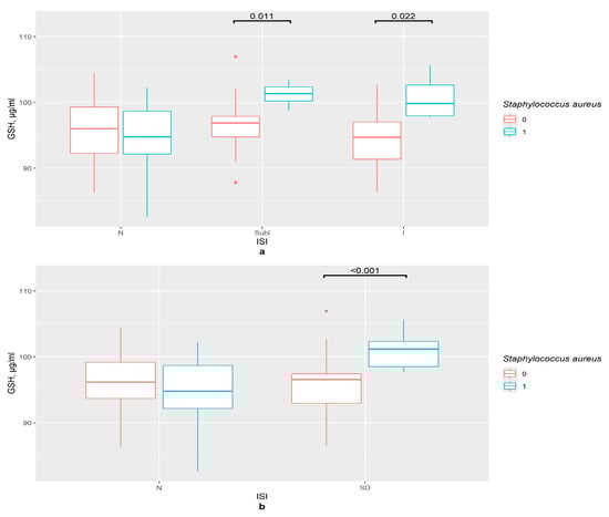 The difference in GSH content in groups: (a) 0—S. aureus not detected (n = 80), 1—S. aureus detected (n = 16); (b) 0—M. stadmanae not detected (n = 65), 1—M. stadmanae detected (n = 31).