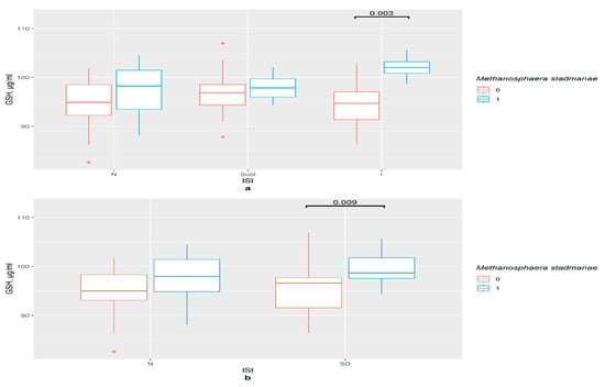 Noticeably, GSH content was higher in women with sleep disturbances in the presence of M. stadmanae compared with the group with an absence of this bacteria (p = 0.032); however, no significant differences between PSQI groups were observed (Figure 6b).