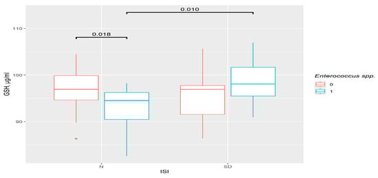 This type of analysis provides one additional result. Insomniac disorders were correlated with a relatively higher level of GSH as compared to the control in the presence of Enterococcus spp. (p = 0.01). In the control group, the GSH level was significantly lower in presence of this genus (p = 0.018) (Figure 5). So, in this case, the difference was not in the insomnia group, but in the control group, suggesting that the participation of bacteria is important.