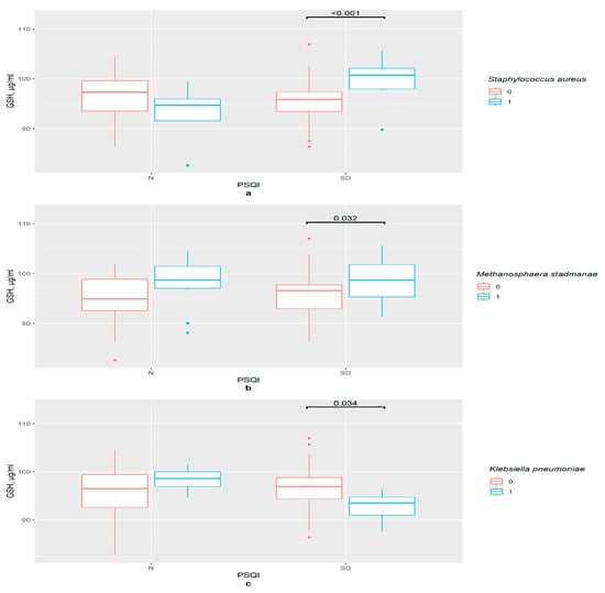 The difference in GSH content in groups: (a) 0—S. aureus not detected, 1—S. aureus detected, N—control (n0 = 31, n1 = 4), SD—sleep disturbance group (n0 = 49, n1 = 12), PSQI—Pittsburgh Sleep Quality Index; (b) 0—M. stadmanae not detected, 1—M. stadmanae detected, N—control (n0 = 23, n1 = 12), SD—sleep disturbance group (n0 = 42, n1 = 19), PSQI—Pittsburgh Sleep Quality Index; (c) 0—K. pneumoniae not detected, 1—K. pneumoniae detected, N—control (n0 = 30, n1 = 5), SD—sleep disturbance group (n0 = 55, n1 = 6), PSQI—Pittsburgh Sleep Quality Index.