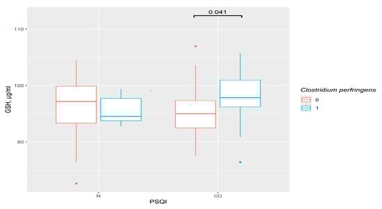 A higher level of GSH was observed in the C. perfringens group with sleep disorders (p = 0.041) (Figure 7). However, the variations between PSQI groups in the presence or absence of this bacteria were invalid.