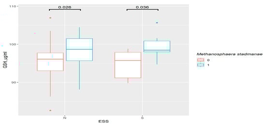In ESS groups, the only important result was the increase in GSH in presence of M. stadmanae (p = 0.026 in the control and p = 0.036 in the excessive daytime sleepiness group). However, this was related to the bacteria, rather than sleep disorders, as observed for the PSQI (Figure 8).