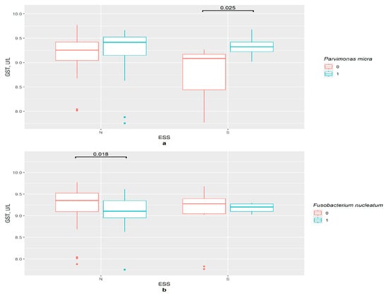 In the absence of P. micra, the GSTP1 concentration was lower in the excessive daytime sleepiness group compared with the control (p = 0.025) (Figure 9a). In the control group, the GSTP1 content was lower in the presence of F. nucleatum (p = 0.018). However, no differences between ESS groups in the F. nucleatum absence/presence subgroups were observed (Figure 9b).