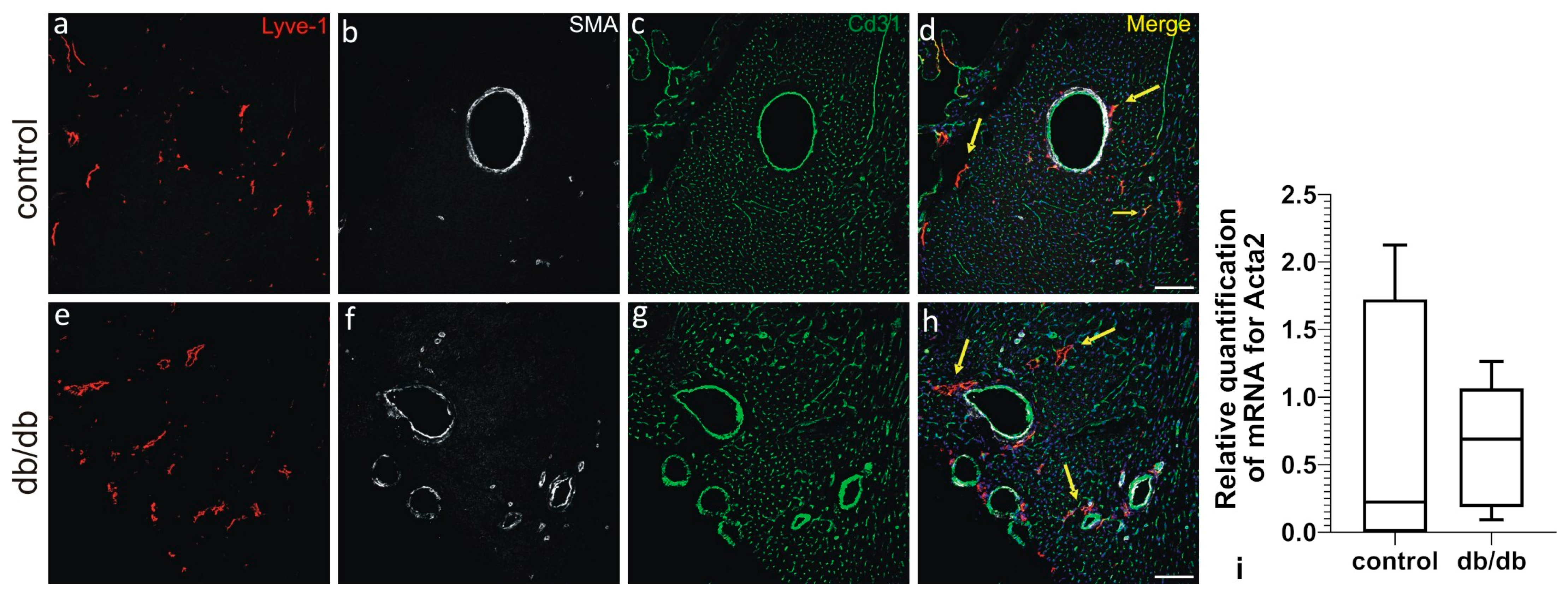 - Flaht-Zabost, A.; Czarnowska, E.; Jankowska-Steifer, E.; Niderla-Bielińska, J.; Żera, T.; Moskalik, A.; Bartkowiak, M.; Bartkowiak, K.; Tomczyk, M.; Majchrzak, B.; et al. Lymphatic Vessel Remodeling in the Hearts of Ang II-Treated Obese db/db Mice as an Integral Component of Cardiac Remodeling. Appl. Sci. 2024, 14, 8675. [Google Scholar] [CrossRef]