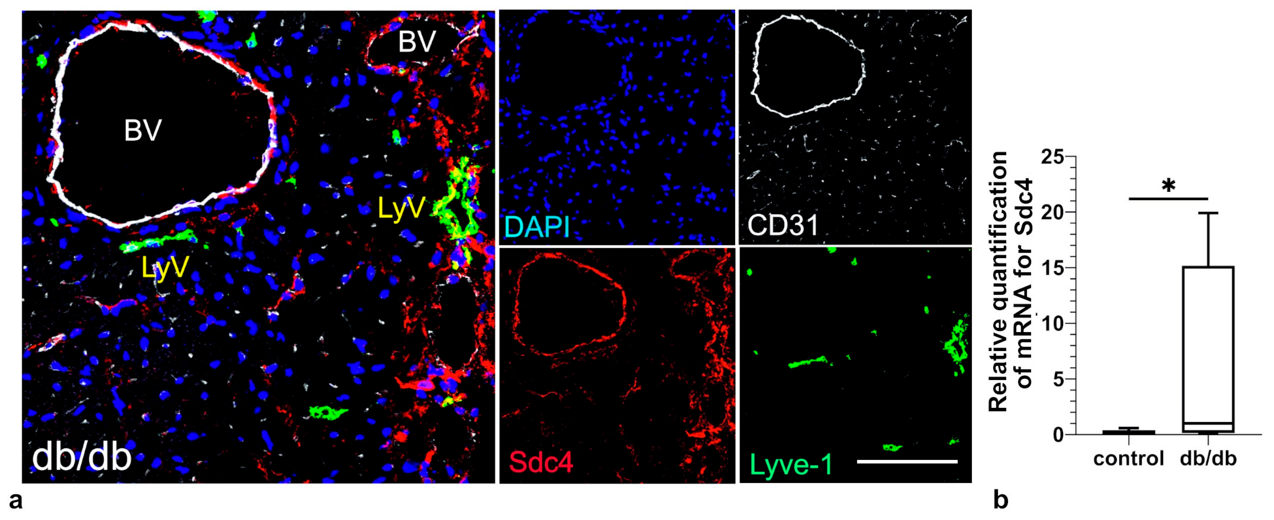 - Wang, Y.; Baeyens, N.; Corti, F.; Tanaka, K.; Fang, J.S.; Zhang, J.; Jin, Y.; Coon, B.; Hirschi, K.K.; Schwartz, M.A.; et al. Syndecan 4 controls lymphatic vasculature remodeling during mouse embryonic development. Development 2016, 143, 4441–4451. [Google Scholar] [CrossRef]