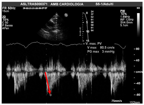 The inclusion criteria of scleroderma patients were history, signs, symptoms, and treatment in accordance with American College of Rheumatology (ACR)/European League Against Rheumatism (EULAR) current guidelines [18]. Other exclusion criteria were the inability to perform 6MWT and/or poor acoustic window. Enrolled patients were monitored in this prospective observational study. Imaging was performed using a Philips IE33 and a 5.2 MHz transducer (Philips Medical Systems, Andover, MA, USA). A two-dimensional Doppler examination was performed using views specifically designed to optimize the RV imaging [19]. To obtain the TAPSE, the apical four-chamber view was used, and an M-mode cursor was placed through the lateral tricuspid annulus in real-time. The TAPSE was measured as the peak excursion of the tricuspid annulus (millimeters) from the end of diastole to the end of systole. The PAAT was measured by PW-Doppler through the pulmonary valve jet from the short-axis view as the interval (msc) between the onset of ejection and the peak flow velocity (Figure 1).