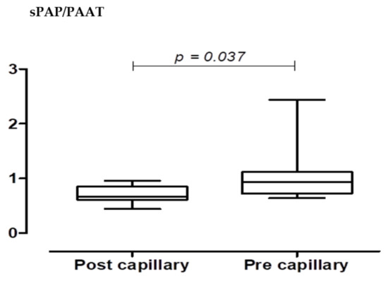 The initial data derived from the analysis of the 20 Ssc patients show that those presenting pre-capillary PH at cardiac catheterization had a sPAP/PAAT ratio >of 0.40 ± 0.05. Patients with post-capillary PH had a sPAP/PAAT >of 0.28 There was a significant correlation between sPAP/PAAT and WD, but not with PVR, perhaps due to this parameter having a greater correlation with cardiac output and arterial ventricle coupling.
