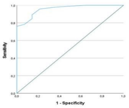 Area under the receiver-operating characteristic curve (AUC-ROC) method plotting the true-positive rate as a function of the false-positive rate for a cutoff point of sPAP with respect to a 0.26 ratio of sPAP/PAAT, as the threshold value, showed 0.957 AUC-ROC value (p = 0.0001).