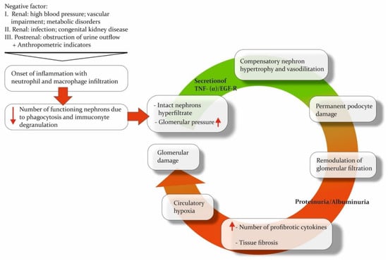 Regardless of the etiology of the damaging factor, CKD is based on similar pathogenetic mechanisms: loss of functional nephrons, damage to the convoluted tubules, inflammation, and fibrosis. An inflammatory reaction develops in the kidney parenchyma after exposure to any negative factor. This reaction leads to neutrophilic and macrophage infiltration and the proliferation of mesangial cells []. At the same time, the decrease in the number of functioning nephrons leads to the development of a hyperfiltration process in the intact nephrons. These changes compensate for the reduction in the number of active nephrons while at the same time significantly increasing the workload of the functioning nephrons []. The resulting raised glomerular pressure and hyperfiltration trigger the secretion of tumor necrosis factor-alpha/epithelial growth factor receptor (TNF-a/EGF-R), the activation of which induces nephron hypertrophy [,]. Nephron hypertrophy allows glomerular pressure to decrease by increasing the filtering area []. However, this could also result in damage to podocytes and remodeling of the filtration barrier, which raises its permeability and causes clinical manifestations of albuminuria or proteinuria []. Albumin and its complement pass through the filtration barrier, along with immune cells infiltrating damaged tissue. These processes stimulate the release of profibrotic cytokines by glomerular cells, leading to the maintenance of a pro-inflammatory microenvironment and the initiation of fibrosis [,,,]. The extensive growth of connective tissue leads to tissue and circulatory hypoxia, which increases damage to the glomerular and tubular apparatus of the kidney, ultimately completing the “vicious circle” of CKD pathogenesis (Figure 1) [,]. As a result, the CKD-induced processes in the renal parenchyma lead to its remodeling, namely metabolic changes, alterations in the quantitative and qualitative composition of proteins, and tissue structure modifications.