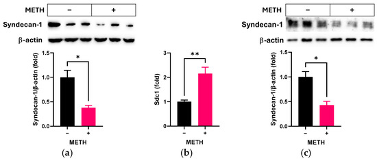 Firstly, we compared the changes in syndecan-1 levels following METH administration in RRMECs and cultured OA. METH led to decreased protein levels of syndecan-1 in both RRMECs (Figure 1a, n = 3, p < 0.05) and cultured OA (Figure 1c, n = 3, p < 0.05). However, the mRNA level of syndecan-1 was higher in METH-administered cells compared to the control group (Figure 1b, n = 6, p < 0.05).