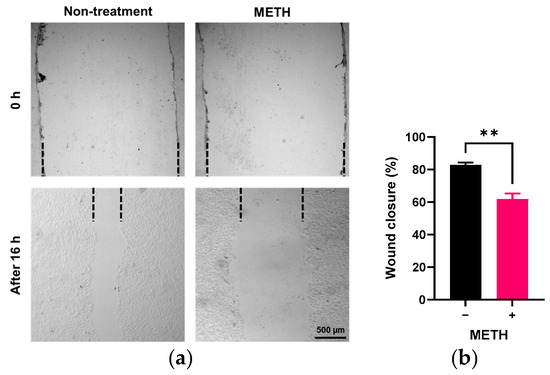 Effect of METH on cell migration in RRMECs. The cells incubated with or without 2 µM for 2 days were further incubated for 16 h after scratch. PBS was used for vehicle control. (a) Representative images of scratched areas were captured using a microscope. The dashed line indicates the boundary of the cell monolayer. (b) RRMEC migration (“wound closure”) was quantified by measuring the scratched area at 0 h and 16 h using ImageJ. Data are presented as means ± SEM (n = 4, ** p < 0.01).