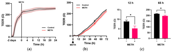 Effect of METH on cell permeability in RRMEC. RRMECs incubated for 48 h were administrated METH for 24 h (a), and RRMECs administered METH at time 0 were incubated for 72 h (b,c). Endothelial barrier function was continuously monitored using a TEER assay (n = 4–5, means ± SEM, * p < 0.05).