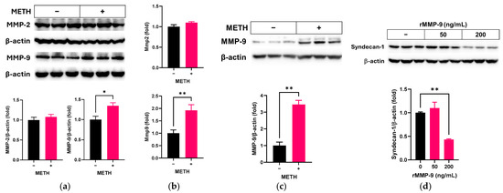 Since MMPs can degrade cellular syndecan-1 [16], we examined the potential change in expression of MMPs by METH in RRMECs and cultured OA. In RRMECs, METH administration significantly elevated the expression levels of MMP-9 protein (n = 3, p < 0.05, Figure 4a) and mRNA (n = 6, p < 0.01, Figure 4b) compared to control, but not MMP-2 (Figure 4a,b). In cultured OA, MMP-9 protein also was increased by METH administration (n = 3, p < 0.01, Figure 4c). To confirm whether MMP-9 is associated with loss of syndecan-1 in endothelial cells, RRMECs were incubated with media containing recombinant MMP-9. As shown in Figure 4d, the protein levels of syndecan-1 in RRMECs were significantly decreased in the presence of recombinant MMP-9 compared to control (n = 3, p < 0.01).