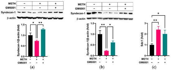 Effect of the MMP inhibitor GM6001 on METH-induced loss of syndecan-1. RRMECs and OV were incubated with 2 µM METH in the presence or absence of 20 µM GM6001 for 3 days. (a) The relative protein expression levels of syndecan-1 in RRMECs were normalized to β-actin using ImageJ (n = 3, means ± SEM, * p < 0.05 and ** p < 0.01). (b) The relative protein expression levels of syndecan-1 in OA were normalized to β-actin using ImageJ (n = 3, means ± SEM, * p < 0.05 and ** p < 0.01). (c) The relative mRNA expression levels of Sdc1 in RRMECs were normalized to Ppia. (n = 6, means ± SEM, * p < 0.05 and ** p < 0.01).